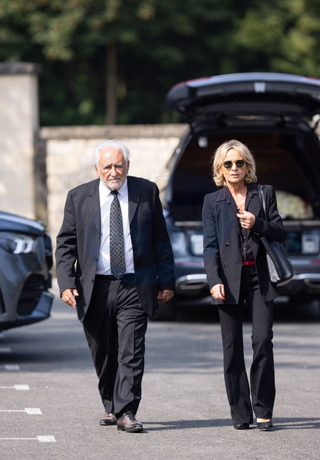 Exclusif - Dominique Strauss-Kahn (DSK) et sa compagne Myriam L'Aouffir - Inhumation de Patrick Guerrand-Hermès (Directeur d'Hermès jusque 2012 et patriarche de la famille) au cimetière de Vineuil-Saint-Firmin dans l'Oise le 20 août 2024. Exclusive - Burial of Patrick Guerrand-Hermès (Director of Hermès until 2012 and patriarch of the family) at the Vineuil-Saint-Firmin cemetery in Oise on August 20, 2024.