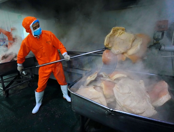 A worker labors in a food processor of sausages and canned pork in Suining in southwest China's Sichuan province Saturday, Aug. 10, 2024., Credit:ZHONG MIN / Avalon