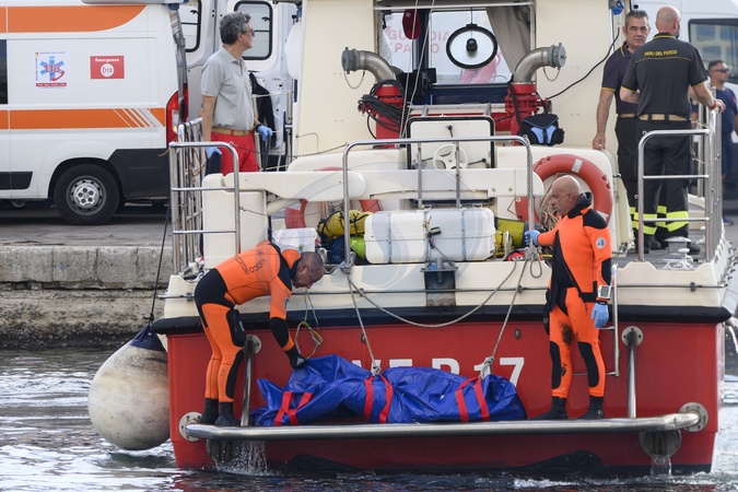 Firefighters and the Italian Coast Guard recover the fifth body from the sailing ship that sank in Porticello. It is the tycoon Mike Lynch, only his daughter Hannah is still missing. Sicily, Italy, August 22, 2024. 15 passengers were rescued after a 56-meter luxury sailing yacht, the Bayesian, with 22 people on board, sank on August 19 due to a tornado that hit the area., Credit:Valeria Ferraro / Avalon