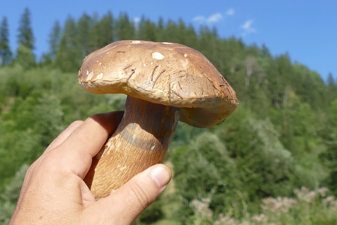 CHERNIVTSI REGION, UKRAINE - JULY 31, 2024 - A man holds a porcini mushroom in the Carpathian Mountains, Vyzhnytsia district, Chernivtsi region, western Ukraine., Credit:Yurii Rylchuk / Avalon