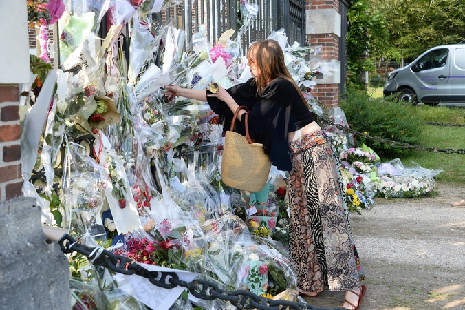 Kwiaty i wiadomości pozostawione przez fanów przed posiadłością Alaina Delona na kilka godzin przed pogrzebem aktora, który odbędzie się w kaplicy na jego posiadłości.