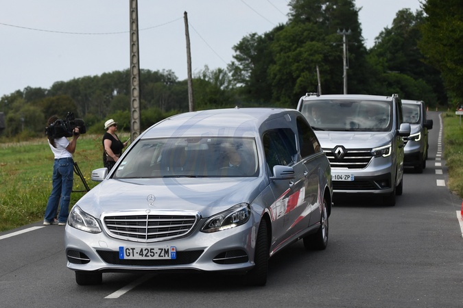 Arrivée du cercueil dans le corbillard à la propriété de Douchy-Montcorbon à quelques heures des obsèques d'Alain Delon