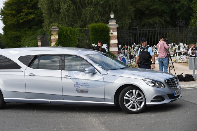 Arrivée du cercueil dans le corbillard à la propriété de Douchy-Montcorbon à quelques heures des obsèques d'Alain Delon