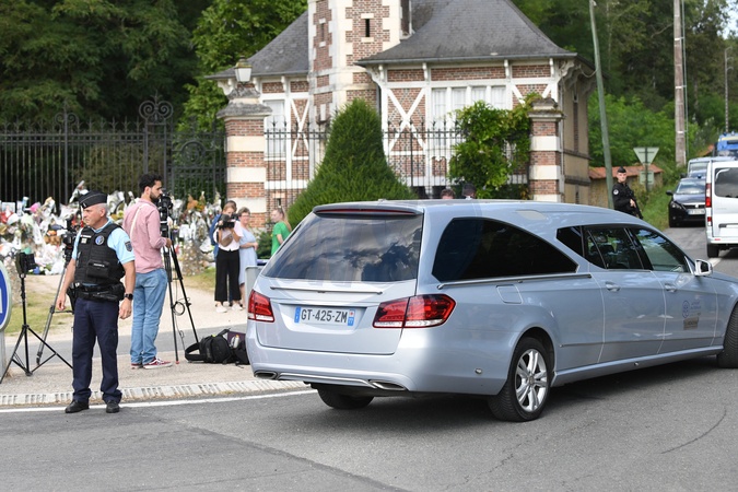 Arrivée du cercueil dans le corbillard à la propriété de Douchy-Montcorbon à quelques heures des obsèques d'Alain Delon