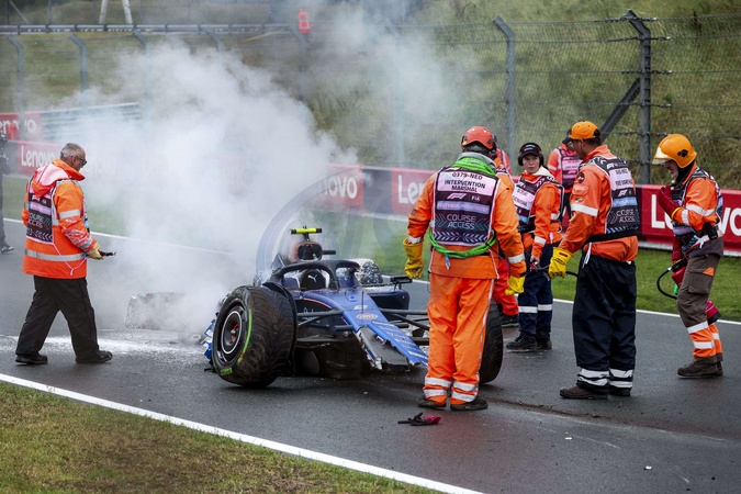 La monoplace de Logan Sargeant (USA) est sortie violemment de la piste et a pris feu lors des essais libres du Grand Prix de F1 des Pays-Bas à Zandvoort