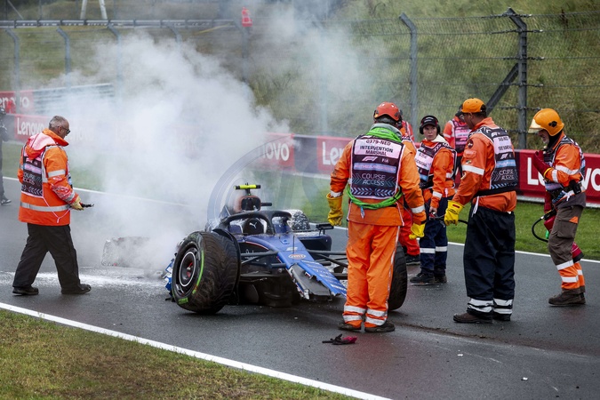 La monoplace de Logan Sargeant (USA) est sortie violemment de la piste et a pris feu lors des essais libres du Grand Prix de F1 des Pays-Bas à Zandvoort
