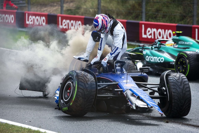 Samochód Logana Sargeanta (USA) brutalnie opuścił tor i zapalił się podczas wolnych treningów przed Grand Prix Holandii F1 w Zandvoort