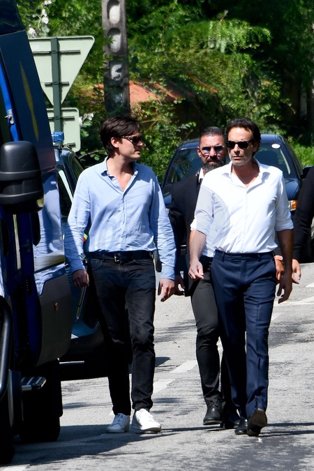 Anthony Delon et son demi-frère Alain-Fabien découvrent les hommages devant les grilles de la propriété de Douchy, quelques heures avant les obsèques de leur père, A.Delon, le 24 août 2024. Décédé le 18 août 2024, l'acteur a rendu son dernier souffle, entouré des siens dans sa propriété de Douchy, où il sera inhumé, le 24 août 2024 vers 17 heures dans une chapelle, construite il y a une vingtaine d'années. Anthony Delon and his half-brother Alain-Fabien discover the tributes in front of the gates of the Douchy property, a few hours before the funeral of their father, A. Delon, on August 24, 2024. Deceased on August 18, 2024, the actor took his last breath, surrounded by his family in his Douchy property, where he will be buried on August 24, 2024 around 5 p.m. in a chapel, built around twenty years ago.