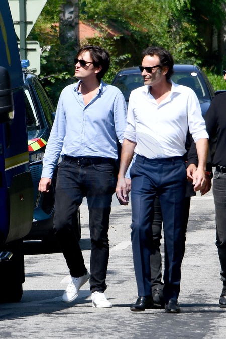 Anthony Delon et son demi-frère Alain-Fabien découvrent les hommages devant les grilles de la propriété de Douchy, quelques heures avant les obsèques de leur père, A.Delon, le 24 août 2024. Décédé le 18 août 2024, l'acteur a rendu son dernier souffle, entouré des siens dans sa propriété de Douchy, où il sera inhumé, le 24 août 2024 vers 17 heures dans une chapelle, construite il y a une vingtaine d'années. Anthony Delon and his half-brother Alain-Fabien discover the tributes in front of the gates of the Douchy property, a few hours before the funeral of their father, A. Delon, on August 24, 2024. Deceased on August 18, 2024, the actor took his last breath, surrounded by his family in his Douchy property, where he will be buried on August 24, 2024 around 5 p.m. in a chapel, built around twenty years ago.