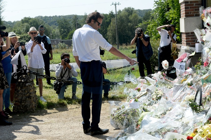 Anthony Delon i jego przyrodni brat Alain-Fabien odkrywają hołdy przed bramą posiadłości Douchy, na kilka godzin przed pogrzebem ich ojca, Alaina Delona