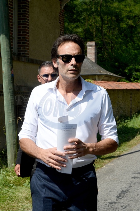 Anthony Delon et son demi-frère Alain-Fabien découvrent les hommages devant les grilles de la propriété de Douchy, quelques heures avant les obsèques de leur père, A.Delon, le 24 août 2024. Décédé le 18 août 2024, l'acteur a rendu son dernier souffle, entouré des siens dans sa propriété de Douchy, où il sera inhumé, le 24 août 2024 vers 17 heures dans une chapelle, construite il y a une vingtaine d'années. Anthony Delon and his half-brother Alain-Fabien discover the tributes in front of the gates of the Douchy property, a few hours before the funeral of their father, A. Delon, on August 24, 2024. Deceased on August 18, 2024, the actor took his last breath, surrounded by his family in his Douchy property, where he will be buried on August 24, 2024 around 5 p.m. in a chapel, built around twenty years ago.