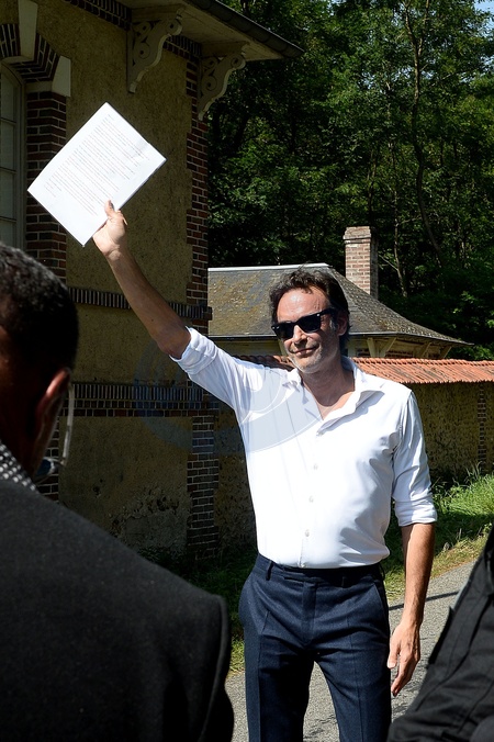 Anthony Delon et son demi-frère Alain-Fabien découvrent les hommages devant les grilles de la propriété de Douchy, quelques heures avant les obsèques de leur père, A.Delon, le 24 août 2024. Décédé le 18 août 2024, l'acteur a rendu son dernier souffle, entouré des siens dans sa propriété de Douchy, où il sera inhumé, le 24 août 2024 vers 17 heures dans une chapelle, construite il y a une vingtaine d'années. Anthony Delon and his half-brother Alain-Fabien discover the tributes in front of the gates of the Douchy property, a few hours before the funeral of their father, A. Delon, on August 24, 2024. Deceased on August 18, 2024, the actor took his last breath, surrounded by his family in his Douchy property, where he will be buried on August 24, 2024 around 5 p.m. in a chapel, built around twenty years ago.