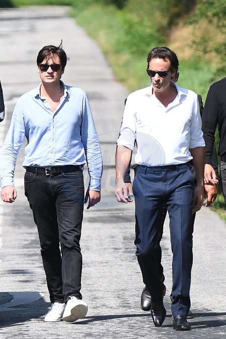 Anthony Delon et son demi-frère Alain-Fabien découvrent les hommages devant les grilles de la propriété de Douchy, quelques heures avant les obsèques de leur père, A.Delon, le 24 août 2024. Décédé le 18 août 2024, l'acteur a rendu son dernier souffle, entouré des siens dans sa propriété de Douchy, où il sera inhumé, le 24 août 2024 vers 17 heures dans une chapelle, construite il y a une vingtaine d'années. Anthony Delon and his half-brother Alain-Fabien discover the tributes in front of the gates of the Douchy property, a few hours before the funeral of their father, A. Delon, on August 24, 2024. Deceased on August 18, 2024, the actor took his last breath, surrounded by his family in his Douchy property, where he will be buried on August 24, 2024 around 5 p.m. in a chapel, built around twenty years ago.