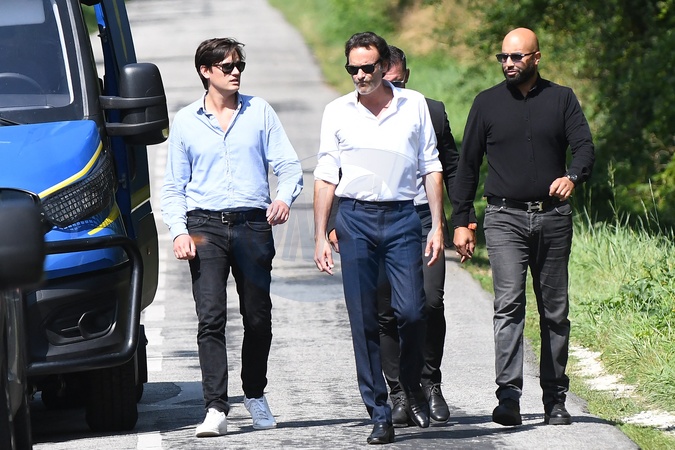 Anthony Delon et son demi-frère Alain-Fabien découvrent les hommages devant les grilles de la propriété de Douchy, quelques heures avant les obsèques de leur père, A.Delon, le 24 août 2024. Décédé le 18 août 2024, l'acteur a rendu son dernier souffle, entouré des siens dans sa propriété de Douchy, où il sera inhumé, le 24 août 2024 vers 17 heures dans une chapelle, construite il y a une vingtaine d'années. Anthony Delon and his half-brother Alain-Fabien discover the tributes in front of the gates of the Douchy property, a few hours before the funeral of their father, A. Delon, on August 24, 2024. Deceased on August 18, 2024, the actor took his last breath, surrounded by his family in his Douchy property, where he will be buried on August 24, 2024 around 5 p.m. in a chapel, built around twenty years ago.