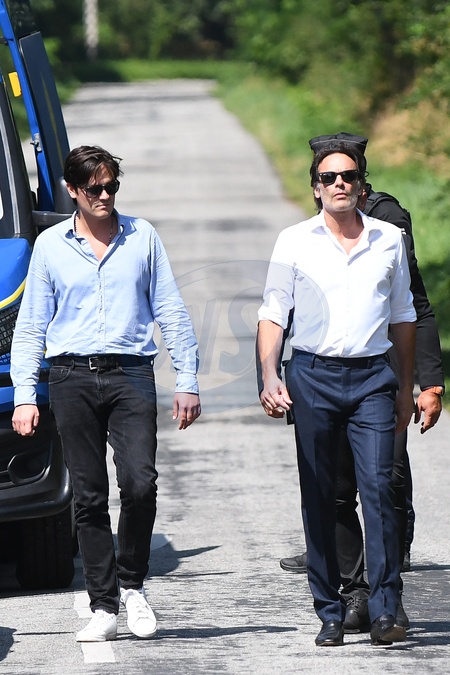 Anthony Delon et son demi-frère Alain-Fabien découvrent les hommages devant les grilles de la propriété de Douchy, quelques heures avant les obsèques de leur père, A.Delon, le 24 août 2024. Décédé le 18 août 2024, l'acteur a rendu son dernier souffle, entouré des siens dans sa propriété de Douchy, où il sera inhumé, le 24 août 2024 vers 17 heures dans une chapelle, construite il y a une vingtaine d'années. Anthony Delon and his half-brother Alain-Fabien discover the tributes in front of the gates of the Douchy property, a few hours before the funeral of their father, A. Delon, on August 24, 2024. Deceased on August 18, 2024, the actor took his last breath, surrounded by his family in his Douchy property, where he will be buried on August 24, 2024 around 5 p.m. in a chapel, built around twenty years ago.