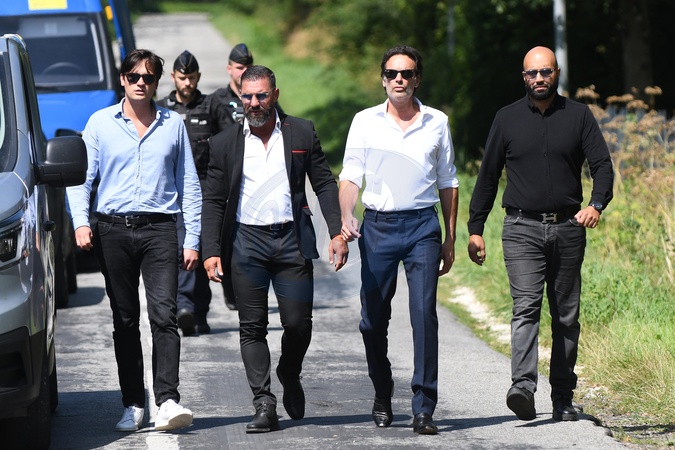 Anthony Delon et son demi-frère Alain-Fabien découvrent les hommages devant les grilles de la propriété de Douchy, quelques heures avant les obsèques de leur père, Alain Delon