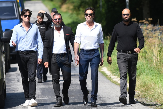 Anthony Delon i jego przyrodni brat Alain-Fabien odkrywają hołdy przed bramą posiadłości Douchy, na kilka godzin przed pogrzebem ich ojca, Alaina Delona