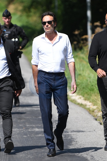 Anthony Delon et son demi-frère Alain-Fabien découvrent les hommages devant les grilles de la propriété de Douchy, quelques heures avant les obsèques de leur père, A.Delon, le 24 août 2024. Décédé le 18 août 2024, l'acteur a rendu son dernier souffle, entouré des siens dans sa propriété de Douchy, où il sera inhumé, le 24 août 2024 vers 17 heures dans une chapelle, construite il y a une vingtaine d'années. Anthony Delon and his half-brother Alain-Fabien discover the tributes in front of the gates of the Douchy property, a few hours before the funeral of their father, A. Delon, on August 24, 2024. Deceased on August 18, 2024, the actor took his last breath, surrounded by his family in his Douchy property, where he will be buried on August 24, 2024 around 5 p.m. in a chapel, built around twenty years ago.