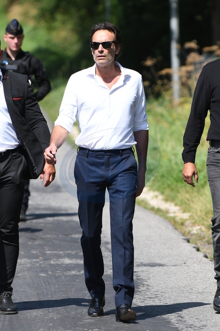 Anthony Delon et son demi-frère Alain-Fabien découvrent les hommages devant les grilles de la propriété de Douchy, quelques heures avant les obsèques de leur père, A.Delon, le 24 août 2024. Décédé le 18 août 2024, l'acteur a rendu son dernier souffle, entouré des siens dans sa propriété de Douchy, où il sera inhumé, le 24 août 2024 vers 17 heures dans une chapelle, construite il y a une vingtaine d'années. Anthony Delon and his half-brother Alain-Fabien discover the tributes in front of the gates of the Douchy property, a few hours before the funeral of their father, A. Delon, on August 24, 2024. Deceased on August 18, 2024, the actor took his last breath, surrounded by his family in his Douchy property, where he will be buried on August 24, 2024 around 5 p.m. in a chapel, built around twenty years ago.