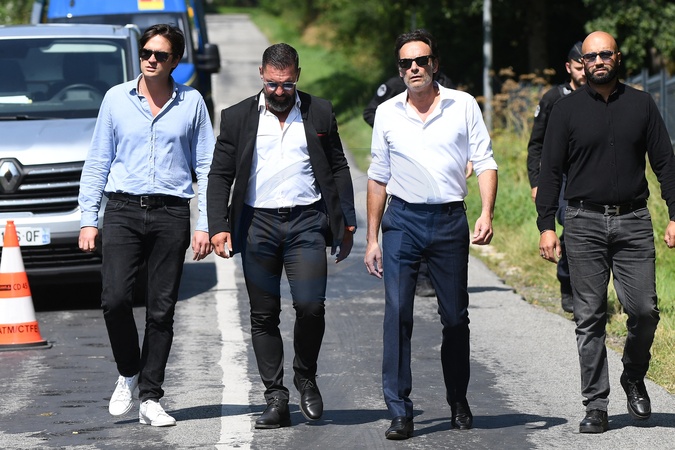 Anthony Delon et son demi-frère Alain-Fabien découvrent les hommages devant les grilles de la propriété de Douchy, quelques heures avant les obsèques de leur père, A.Delon, le 24 août 2024. Décédé le 18 août 2024, l'acteur a rendu son dernier souffle, entouré des siens dans sa propriété de Douchy, où il sera inhumé, le 24 août 2024 vers 17 heures dans une chapelle, construite il y a une vingtaine d'années. Anthony Delon and his half-brother Alain-Fabien discover the tributes in front of the gates of the Douchy property, a few hours before the funeral of their father, A. Delon, on August 24, 2024. Deceased on August 18, 2024, the actor took his last breath, surrounded by his family in his Douchy property, where he will be buried on August 24, 2024 around 5 p.m. in a chapel, built around twenty years ago.