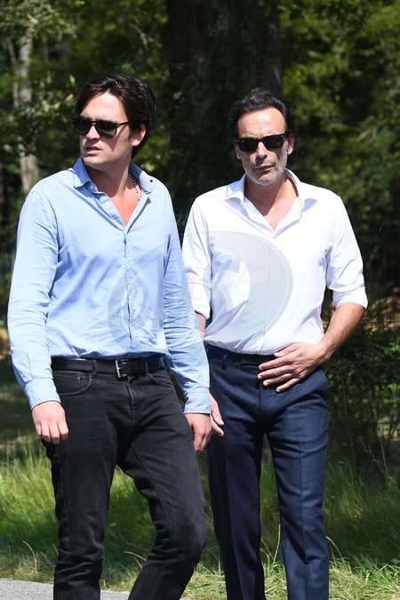 Anthony Delon et son demi-frère Alain-Fabien découvrent les hommages devant les grilles de la propriété de Douchy, quelques heures avant les obsèques de leur père, A.Delon, le 24 août 2024. Décédé le 18 août 2024, l'acteur a rendu son dernier souffle, entouré des siens dans sa propriété de Douchy, où il sera inhumé, le 24 août 2024 vers 17 heures dans une chapelle, construite il y a une vingtaine d'années. Anthony Delon and his half-brother Alain-Fabien discover the tributes in front of the gates of the Douchy property, a few hours before the funeral of their father, A. Delon, on August 24, 2024. Deceased on August 18, 2024, the actor took his last breath, surrounded by his family in his Douchy property, where he will be buried on August 24, 2024 around 5 p.m. in a chapel, built around twenty years ago.