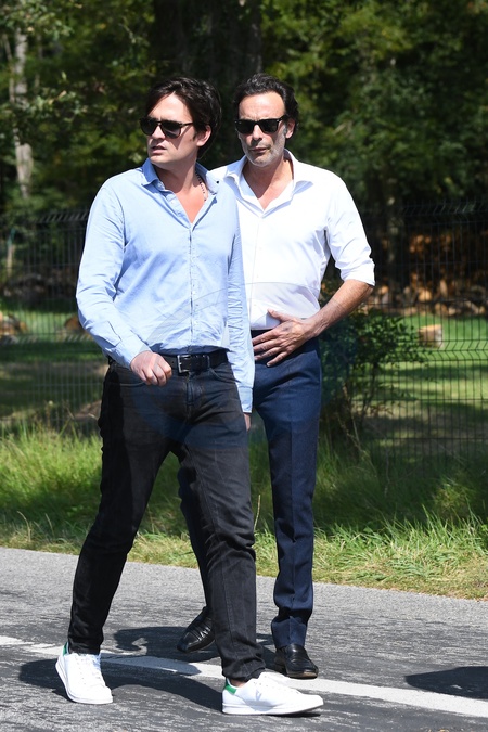 Anthony Delon et son demi-frère Alain-Fabien découvrent les hommages devant les grilles de la propriété de Douchy, quelques heures avant les obsèques de leur père, A.Delon, le 24 août 2024. Décédé le 18 août 2024, l'acteur a rendu son dernier souffle, entouré des siens dans sa propriété de Douchy, où il sera inhumé, le 24 août 2024 vers 17 heures dans une chapelle, construite il y a une vingtaine d'années. Anthony Delon and his half-brother Alain-Fabien discover the tributes in front of the gates of the Douchy property, a few hours before the funeral of their father, A. Delon, on August 24, 2024. Deceased on August 18, 2024, the actor took his last breath, surrounded by his family in his Douchy property, where he will be buried on August 24, 2024 around 5 p.m. in a chapel, built around twenty years ago.