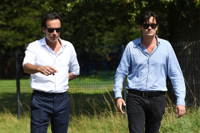 Anthony Delon et son demi-frère Alain-Fabien découvrent les hommages devant les grilles de la propriété de Douchy, quelques heures avant les obsèques de leur père, A.Delon, le 24 août 2024. Décédé le 18 août 2024, l'acteur a rendu son dernier souffle, entouré des siens dans sa propriété de Douchy, où il sera inhumé, le 24 août 2024 vers 17 heures dans une chapelle, construite il y a une vingtaine d'années. Anthony Delon and his half-brother Alain-Fabien discover the tributes in front of the gates of the Douchy property, a few hours before the funeral of their father, A. Delon, on August 24, 2024. Deceased on August 18, 2024, the actor took his last breath, surrounded by his family in his Douchy property, where he will be buried on August 24, 2024 around 5 p.m. in a chapel, built around twenty years ago.