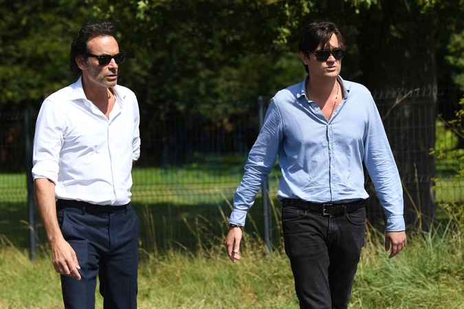 Anthony Delon et son demi-frère Alain-Fabien découvrent les hommages devant les grilles de la propriété de Douchy, quelques heures avant les obsèques de leur père, A.Delon, le 24 août 2024. Décédé le 18 août 2024, l'acteur a rendu son dernier souffle, entouré des siens dans sa propriété de Douchy, où il sera inhumé, le 24 août 2024 vers 17 heures dans une chapelle, construite il y a une vingtaine d'années. Anthony Delon and his half-brother Alain-Fabien discover the tributes in front of the gates of the Douchy property, a few hours before the funeral of their father, A. Delon, on August 24, 2024. Deceased on August 18, 2024, the actor took his last breath, surrounded by his family in his Douchy property, where he will be buried on August 24, 2024 around 5 p.m. in a chapel, built around twenty years ago.