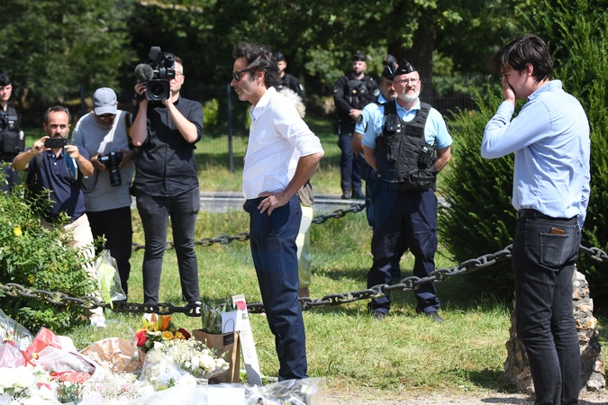 Anthony Delon et son demi-frère Alain-Fabien découvrent les hommages devant les grilles de la propriété de Douchy, quelques heures avant les obsèques de leur père, A.Delon, le 24 août 2024. Décédé le 18 août 2024, l'acteur a rendu son dernier souffle, entouré des siens dans sa propriété de Douchy, où il sera inhumé, le 24 août 2024 vers 17 heures dans une chapelle, construite il y a une vingtaine d'années. Anthony Delon and his half-brother Alain-Fabien discover the tributes in front of the gates of the Douchy property, a few hours before the funeral of their father, A. Delon, on August 24, 2024. Deceased on August 18, 2024, the actor took his last breath, surrounded by his family in his Douchy property, where he will be buried on August 24, 2024 around 5 p.m. in a chapel, built around twenty years ago.