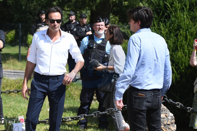 Anthony Delon et son demi-frère Alain-Fabien découvrent les hommages devant les grilles de la propriété de Douchy, quelques heures avant les obsèques de leur père, A.Delon, le 24 août 2024. Décédé le 18 août 2024, l'acteur a rendu son dernier souffle, entouré des siens dans sa propriété de Douchy, où il sera inhumé, le 24 août 2024 vers 17 heures dans une chapelle, construite il y a une vingtaine d'années. Anthony Delon and his half-brother Alain-Fabien discover the tributes in front of the gates of the Douchy property, a few hours before the funeral of their father, A. Delon, on August 24, 2024. Deceased on August 18, 2024, the actor took his last breath, surrounded by his family in his Douchy property, where he will be buried on August 24, 2024 around 5 p.m. in a chapel, built around twenty years ago.