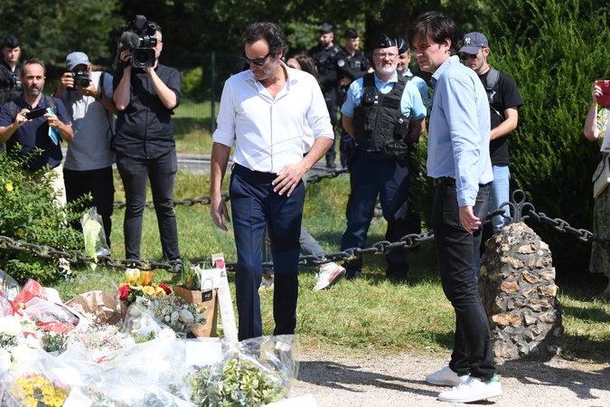 Anthony Delon et son demi-frère Alain-Fabien découvrent les hommages devant les grilles de la propriété de Douchy, quelques heures avant les obsèques de leur père, A.Delon, le 24 août 2024. Décédé le 18 août 2024, l'acteur a rendu son dernier souffle, entouré des siens dans sa propriété de Douchy, où il sera inhumé, le 24 août 2024 vers 17 heures dans une chapelle, construite il y a une vingtaine d'années. Anthony Delon and his half-brother Alain-Fabien discover the tributes in front of the gates of the Douchy property, a few hours before the funeral of their father, A. Delon, on August 24, 2024. Deceased on August 18, 2024, the actor took his last breath, surrounded by his family in his Douchy property, where he will be buried on August 24, 2024 around 5 p.m. in a chapel, built around twenty years ago.