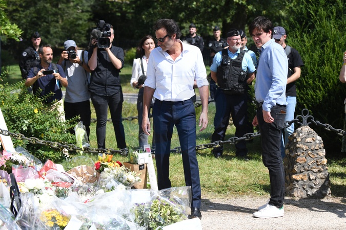 Anthony Delon et son demi-frère Alain-Fabien découvrent les hommages devant les grilles de la propriété de Douchy, quelques heures avant les obsèques de leur père, A.Delon, le 24 août 2024. Décédé le 18 août 2024, l'acteur a rendu son dernier souffle, entouré des siens dans sa propriété de Douchy, où il sera inhumé, le 24 août 2024 vers 17 heures dans une chapelle, construite il y a une vingtaine d'années. Anthony Delon and his half-brother Alain-Fabien discover the tributes in front of the gates of the Douchy property, a few hours before the funeral of their father, A. Delon, on August 24, 2024. Deceased on August 18, 2024, the actor took his last breath, surrounded by his family in his Douchy property, where he will be buried on August 24, 2024 around 5 p.m. in a chapel, built around twenty years ago.