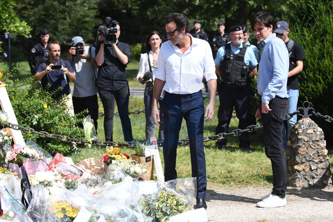 Anthony Delon et son demi-frère Alain-Fabien découvrent les hommages devant les grilles de la propriété de Douchy, quelques heures avant les obsèques de leur père, Alain Delon
