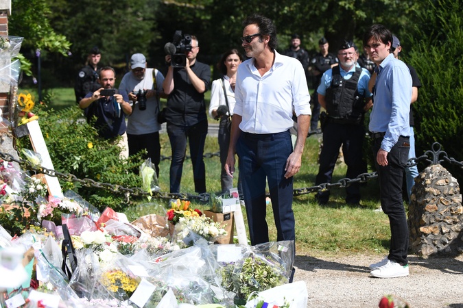 Anthony Delon et son demi-frère Alain-Fabien découvrent les hommages devant les grilles de la propriété de Douchy, quelques heures avant les obsèques de leur père, A.Delon, le 24 août 2024. Décédé le 18 août 2024, l'acteur a rendu son dernier souffle, entouré des siens dans sa propriété de Douchy, où il sera inhumé, le 24 août 2024 vers 17 heures dans une chapelle, construite il y a une vingtaine d'années. Anthony Delon and his half-brother Alain-Fabien discover the tributes in front of the gates of the Douchy property, a few hours before the funeral of their father, A. Delon, on August 24, 2024. Deceased on August 18, 2024, the actor took his last breath, surrounded by his family in his Douchy property, where he will be buried on August 24, 2024 around 5 p.m. in a chapel, built around twenty years ago.