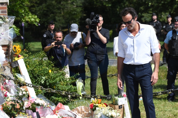 Anthony Delon et son demi-frère Alain-Fabien découvrent les hommages devant les grilles de la propriété de Douchy, quelques heures avant les obsèques de leur père, A.Delon, le 24 août 2024. Décédé le 18 août 2024, l'acteur a rendu son dernier souffle, entouré des siens dans sa propriété de Douchy, où il sera inhumé, le 24 août 2024 vers 17 heures dans une chapelle, construite il y a une vingtaine d'années. Anthony Delon and his half-brother Alain-Fabien discover the tributes in front of the gates of the Douchy property, a few hours before the funeral of their father, A. Delon, on August 24, 2024. Deceased on August 18, 2024, the actor took his last breath, surrounded by his family in his Douchy property, where he will be buried on August 24, 2024 around 5 p.m. in a chapel, built around twenty years ago.