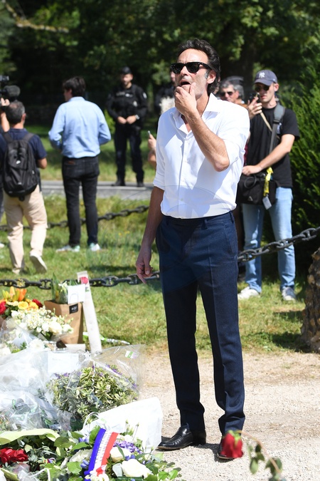 Anthony Delon et son demi-frère Alain-Fabien découvrent les hommages devant les grilles de la propriété de Douchy, quelques heures avant les obsèques de leur père, A.Delon, le 24 août 2024. Décédé le 18 août 2024, l'acteur a rendu son dernier souffle, entouré des siens dans sa propriété de Douchy, où il sera inhumé, le 24 août 2024 vers 17 heures dans une chapelle, construite il y a une vingtaine d'années. Anthony Delon and his half-brother Alain-Fabien discover the tributes in front of the gates of the Douchy property, a few hours before the funeral of their father, A. Delon, on August 24, 2024. Deceased on August 18, 2024, the actor took his last breath, surrounded by his family in his Douchy property, where he will be buried on August 24, 2024 around 5 p.m. in a chapel, built around twenty years ago.
