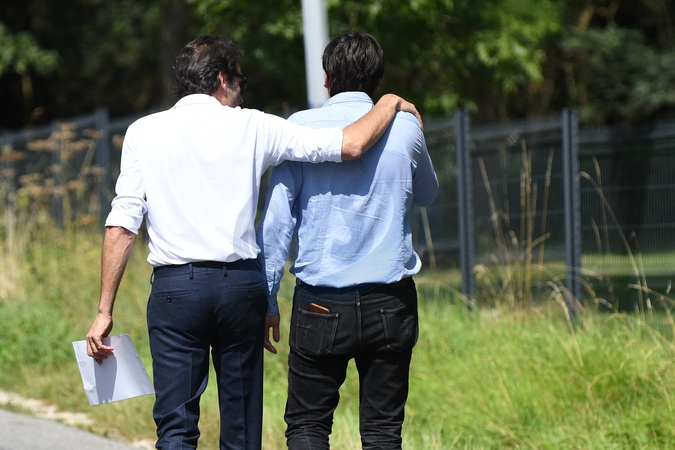 Anthony Delon et son demi-frère Alain-Fabien découvrent les hommages devant les grilles de la propriété de Douchy, quelques heures avant les obsèques de leur père, A.Delon, le 24 août 2024. Décédé le 18 août 2024, l'acteur a rendu son dernier souffle, entouré des siens dans sa propriété de Douchy, où il sera inhumé, le 24 août 2024 vers 17 heures dans une chapelle, construite il y a une vingtaine d'années. Anthony Delon and his half-brother Alain-Fabien discover the tributes in front of the gates of the Douchy property, a few hours before the funeral of their father, A. Delon, on August 24, 2024. Deceased on August 18, 2024, the actor took his last breath, surrounded by his family in his Douchy property, where he will be buried on August 24, 2024 around 5 p.m. in a chapel, built around twenty years ago.