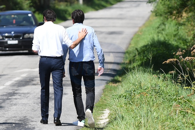 Anthony Delon et son demi-frère Alain-Fabien découvrent les hommages devant les grilles de la propriété de Douchy, quelques heures avant les obsèques de leur père, A.Delon, le 24 août 2024. Décédé le 18 août 2024, l'acteur a rendu son dernier souffle, entouré des siens dans sa propriété de Douchy, où il sera inhumé, le 24 août 2024 vers 17 heures dans une chapelle, construite il y a une vingtaine d'années. Anthony Delon and his half-brother Alain-Fabien discover the tributes in front of the gates of the Douchy property, a few hours before the funeral of their father, A. Delon, on August 24, 2024. Deceased on August 18, 2024, the actor took his last breath, surrounded by his family in his Douchy property, where he will be buried on August 24, 2024 around 5 p.m. in a chapel, built around twenty years ago.