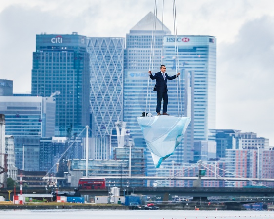 London,UK, 24th Aug 2024. THAW is the European premiere of a performance by Australian physical theatre company Legs On The Wall in response to the devastating bushfires of 2019/20 and global climate change. The performance, taking place at the University of East London's Docklands Campus, brings spectators face to face with the urgent need for global climate action through a performance over 8 hours and sees a performer on a giant melting 2.5 tonne block of ice suspended from a tall crane, with Canary Wharf, City Airport and Woolwich in the backgroud., Credit:Avalon