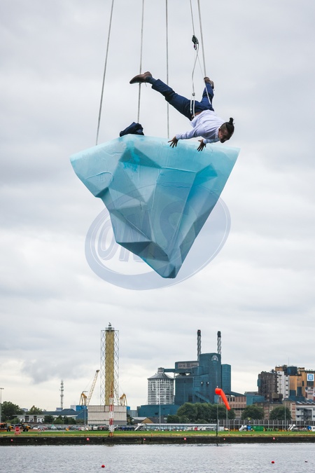 London,UK, 24th Aug 2024. THAW is the European premiere of a performance by Australian physical theatre company Legs On The Wall in response to the devastating bushfires of 2019/20 and global climate change. The performance, taking place at the University of East London's Docklands Campus, brings spectators face to face with the urgent need for global climate action through a performance over 8 hours and sees a performer on a giant melting 2.5 tonne block of ice suspended from a tall crane, with Canary Wharf, City Airport and Woolwich in the backgroud., Credit:Avalon