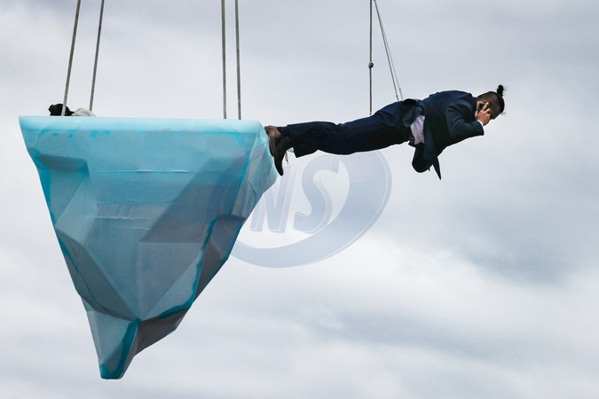 London,UK, 24th Aug 2024. THAW is the European premiere of a performance by Australian physical theatre company Legs On The Wall in response to the devastating bushfires of 2019/20 and global climate change. The performance, taking place at the University of East London's Docklands Campus, brings spectators face to face with the urgent need for global climate action through a performance over 8 hours and sees a performer on a giant melting 2.5 tonne block of ice suspended from a tall crane, with Canary Wharf, City Airport and Woolwich in the backgroud., Credit:Avalon