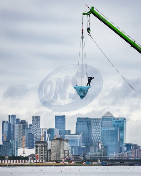 London,UK, 24th Aug 2024. THAW is the European premiere of a performance by Australian physical theatre company Legs On The Wall in response to the devastating bushfires of 2019/20 and global climate change. The performance, taking place at the University of East London's Docklands Campus, brings spectators face to face with the urgent need for global climate action through a performance over 8 hours and sees a performer on a giant melting 2.5 tonne block of ice suspended from a tall crane, with Canary Wharf, City Airport and Woolwich in the backgroud., Credit:Avalon