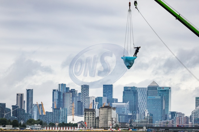 London,UK, 24th Aug 2024. THAW is the European premiere of a performance by Australian physical theatre company Legs On The Wall in response to the devastating bushfires of 2019/20 and global climate change. The performance, taking place at the University of East London's Docklands Campus, brings spectators face to face with the urgent need for global climate action through a performance over 8 hours and sees a performer on a giant melting 2.5 tonne block of ice suspended from a tall crane, with Canary Wharf, City Airport and Woolwich in the backgroud., Credit:Avalon