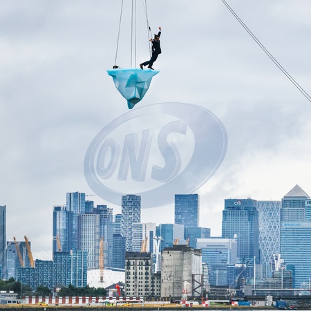 London,UK, 24th Aug 2024. THAW is the European premiere of a performance by Australian physical theatre company Legs On The Wall in response to the devastating bushfires of 2019/20 and global climate change. The performance, taking place at the University of East London's Docklands Campus, brings spectators face to face with the urgent need for global climate action through a performance over 8 hours and sees a performer on a giant melting 2.5 tonne block of ice suspended from a tall crane, with Canary Wharf, City Airport and Woolwich in the backgroud., Credit:Avalon