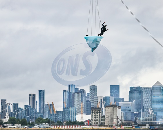 London,UK, 24th Aug 2024. THAW is the European premiere of a performance by Australian physical theatre company Legs On The Wall in response to the devastating bushfires of 2019/20 and global climate change. The performance, taking place at the University of East London's Docklands Campus, brings spectators face to face with the urgent need for global climate action through a performance over 8 hours and sees a performer on a giant melting 2.5 tonne block of ice suspended from a tall crane, with Canary Wharf, City Airport and Woolwich in the backgroud., Credit:Avalon