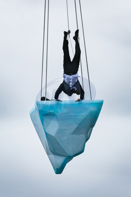 London,UK, 24th Aug 2024. THAW is the European premiere of a performance by Australian physical theatre company Legs On The Wall in response to the devastating bushfires of 2019/20 and global climate change. The performance, taking place at the University of East London's Docklands Campus, brings spectators face to face with the urgent need for global climate action through a performance over 8 hours and sees a performer on a giant melting 2.5 tonne block of ice suspended from a tall crane, with Canary Wharf, City Airport and Woolwich in the backgroud., Credit:Avalon
