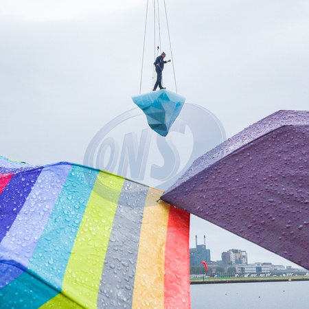 London,UK, 24th Aug 2024. THAW is the European premiere of a performance by Australian physical theatre company Legs On The Wall in response to the devastating bushfires of 2019/20 and global climate change. The performance, taking place at the University of East London's Docklands Campus, brings spectators face to face with the urgent need for global climate action through a performance over 8 hours and sees a performer on a giant melting 2.5 tonne block of ice suspended from a tall crane, with Canary Wharf, City Airport and Woolwich in the backgroud., Credit:IMAGEPLOTTER / Avalon