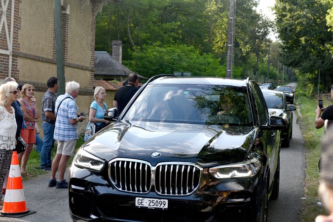 Anouchka Delon et son mari Julien Dereims à la sortie de la propriété de Douchy-Montcorbon après les obsèques d'Alain Delon le 24 août 2024. Anouchka Delon and her husband Julien Dereims leaving the Douchy-Montcorbon property after the funeral of Alain Delon on August 24, 2024.