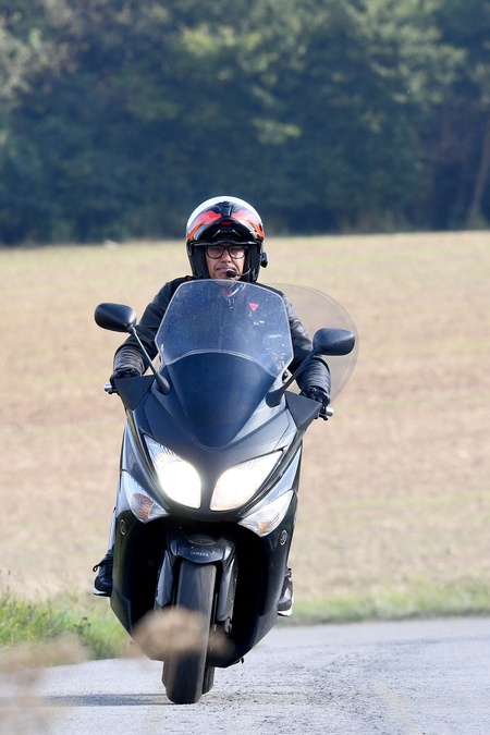Paul Belmondo en scooter - Les invités à la sortie de la propriété de Douchy-Montcorbon après les obsèques d'Alain Delon le 24 août 2024. Guests leaving the Douchy-Montcorbon property after the funeral of Alain Delon on August 24, 2024.