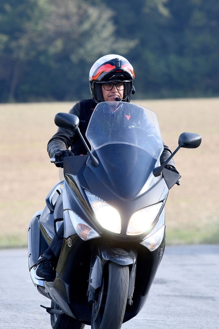 Paul Belmondo en scooter - Les invités à la sortie de la propriété de Douchy-Montcorbon après les obsèques d'Alain Delon le 24 août 2024. Guests leaving the Douchy-Montcorbon property after the funeral of Alain Delon on August 24, 2024.